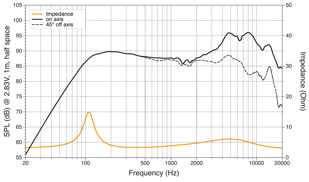 D mm 110 Re Ohm 3,1 Fs Hz 80 Le mH 0,18 Vas I 13,5 Mms g 7,6 Cms mm/N 0,50 BL T*m 4,2 Qts 0,56 Qes 0,67 Qms 3,5 Spl dB 92,5